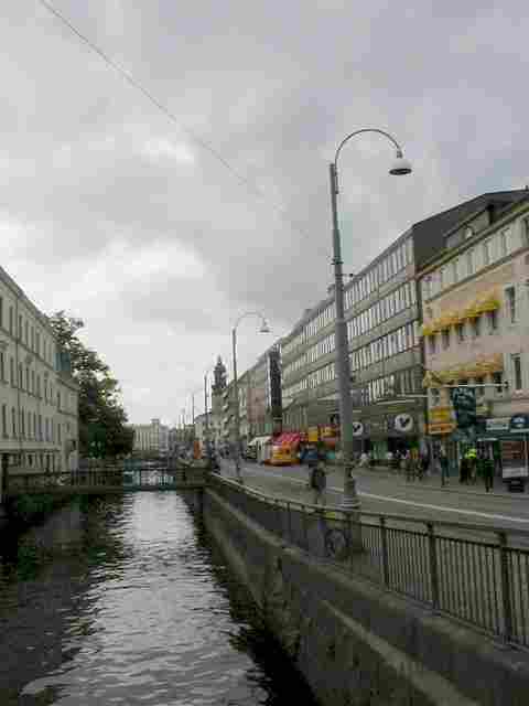 Continued from Part 6Day 23 (Stockholm > Trollhättan)Our final day in Stockholm began by taking down the tent. For once, the rain managed to hold off while we packed up. It was also our last journey on Stockholm's T-bana, a service that has been extremely useful and very efficient, strange considering it is run by Connex. We got to Central Station in plenty of time so while Richard changed some money, I went to buy him a milkshake while Andrew guarded the bags. "A large chocolate milkshake please." "A milkshake? What size?" "Large." "Banana?" "No, chocolate." "Chocolate." He gave me a vanilla milkshake. I also went to enquire about getting the train to Mariestad. The woman at the information desk was adamant this was not possible. We decided to get on the Gothenburg train anyway and with the help of the Rough Guide settled on Trollhättan, north of Gothenburg. The five-hour trip passed with little incident we changed at Gothenburg on to an Intercity, which took us straight to Trollhättan. Although finding Trollhättan had been easy enough finding its campsite was rather harder. The proprietor of a pizzeria gave me directions, which three men at a bus stop pointed us in completely the other direction. We finally made it to the campsite and booked in for four nights at a cheap 100kr/night. After pitching the tent we went for a walk into town. For dinner we returned to the pizzeria, where pizzas were an astonishingly cheap 30kr each (£2!) We then headed into the town itself. By luck we had arrived at the conclusion of the annual festival, so the centre was busy with people, there were various concerts going on and a carnival atmosphere was in the air. Later we returned to the tent and it began to rain. A large puddle soon formed outside my end of the tent. This would have been bearable had I not left my moneybelt in the puddle... Day 24 (Trollhättan and Gothenburg)My first task was to inspect my soggy moneybelt. Most items hadn't fared too badly but the InterRail pass was rather wet and the plane tickets had to be gently prised apart. I left Richard with my slowly drying travellers' cheques and set off with Andrew on the train to Gothenburg (spelt Gotebörg, pronounced Yur-te-boy!) We stated in Gustav Adolfs Torg, where a statue of Gustav Adolf points at the ground. "Here I will build my city" he apparently declaimed. And he didn't do a bad job of it either. Gothenburg was an inherently likeable city, with its canals, busy streets and impressive buildings, both old and new.